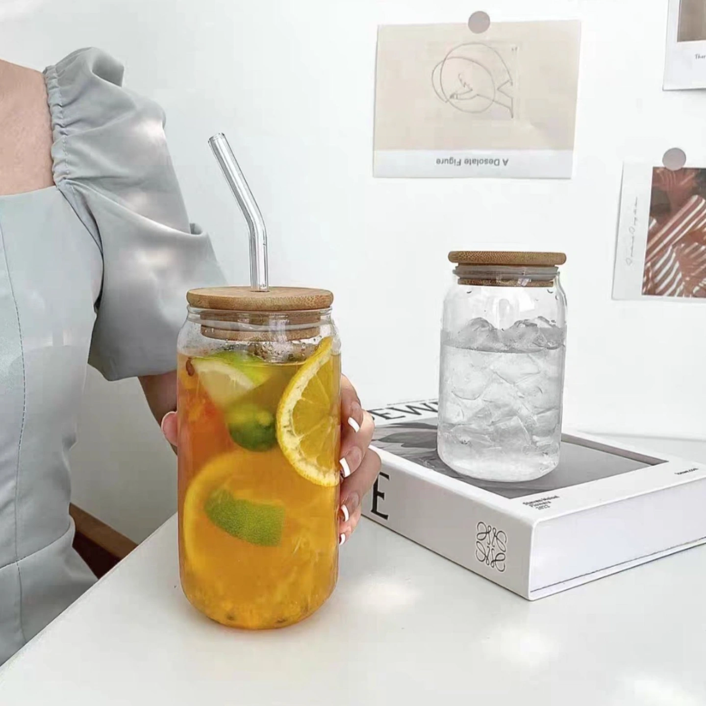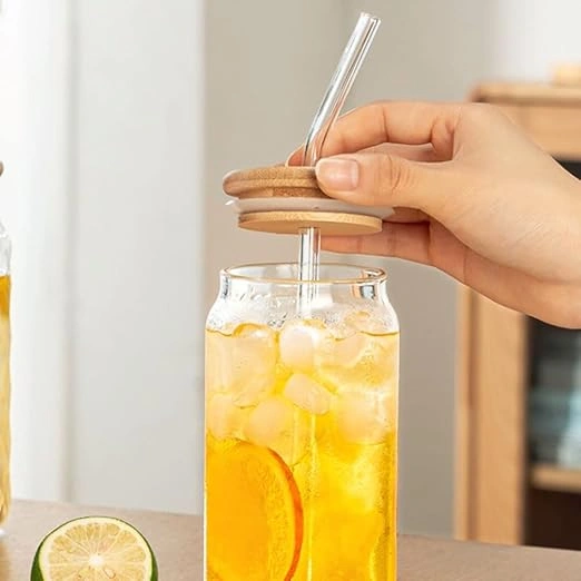 Drinking Glasses with Bamboo Lids and Glass Straw 1 Pcs Set, Classic design, very practical combination suit.