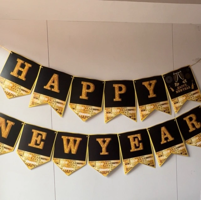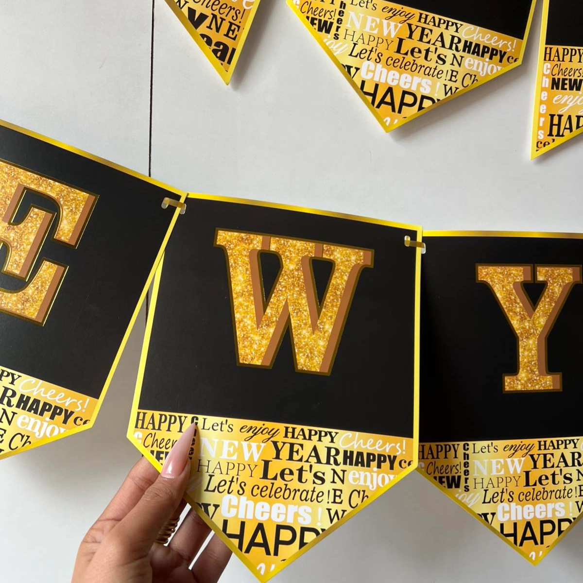PRE-STRUNG: No need to waste time putting them together, unlike others our Happy New Year Banner 2026 is all pre-strung on 10ft long ropes. No DIY required! All you have to do is hang and you’re ready to go.This happy new year banner gold comes pre-assembled with adjustable feature, the new years eve banner cards can be move to your desired space interval