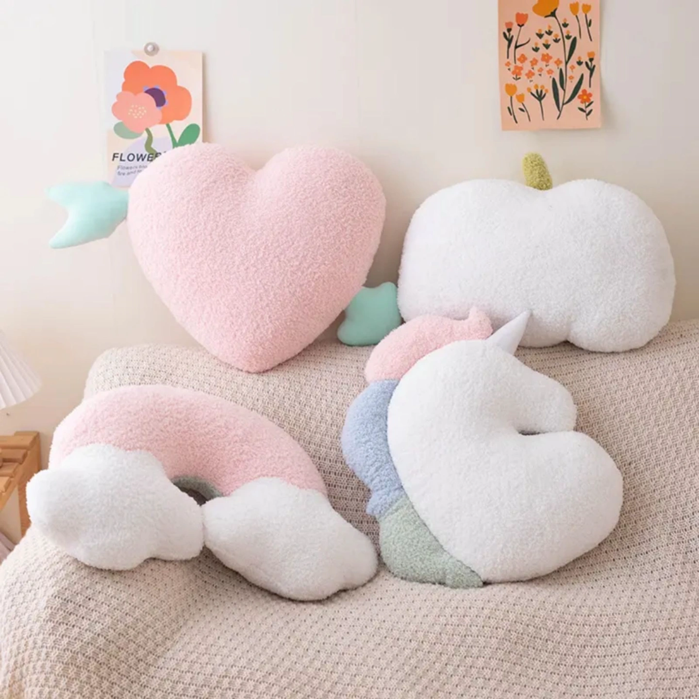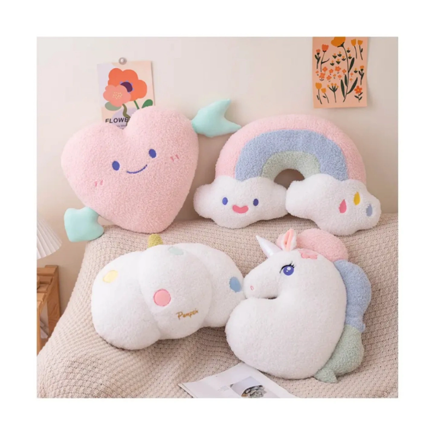Add a touch of charm and comfort to your space with these adorable Kawaii Plush Pillows. Designed with cute shapes like a heart, rainbow cloud, unicorn, and fluffy cloud, these cushions bring a soft pastel aesthetic that brightens any bedroom, nursery, or living room. The friendly cartoon faces and soothing colors create a warm, cozy atmosphere perfect for relaxing or decorating.
