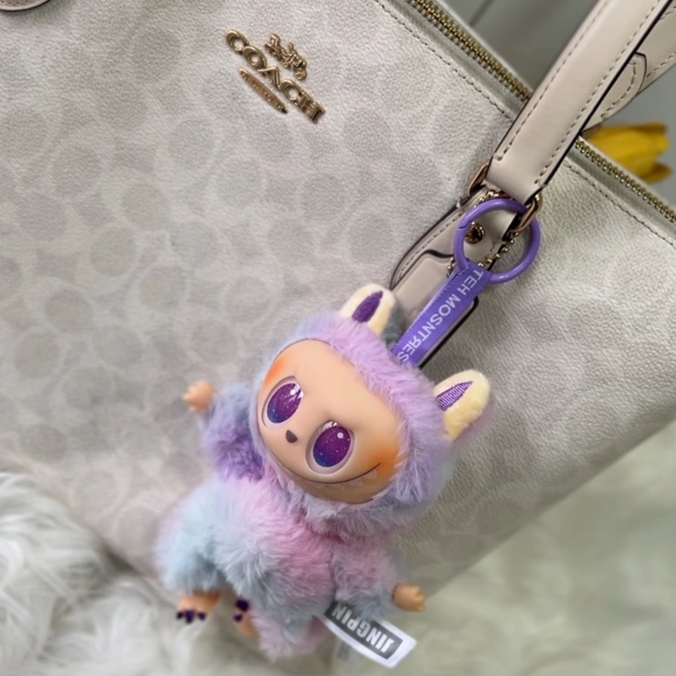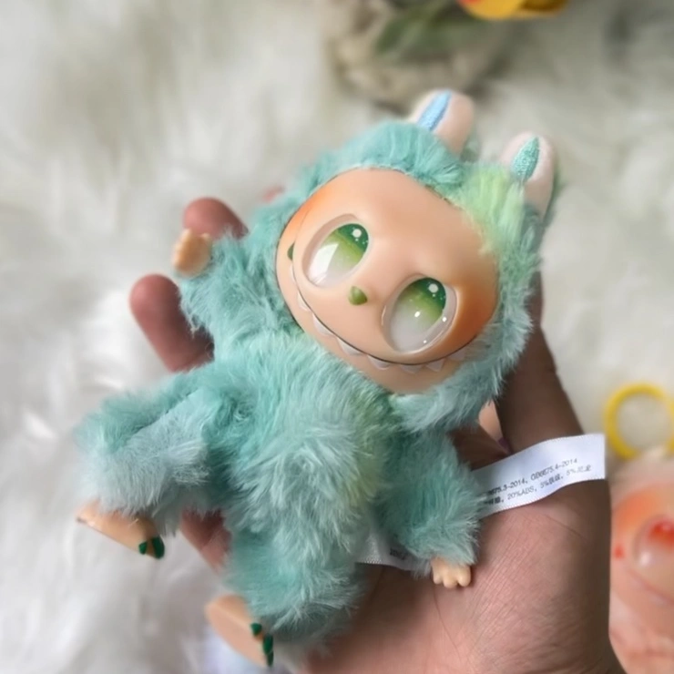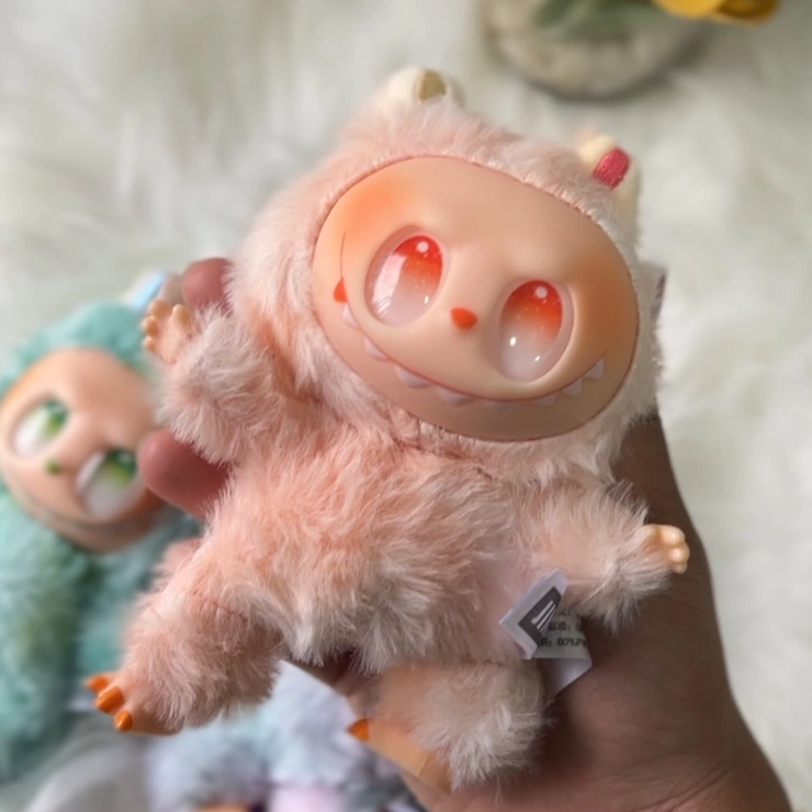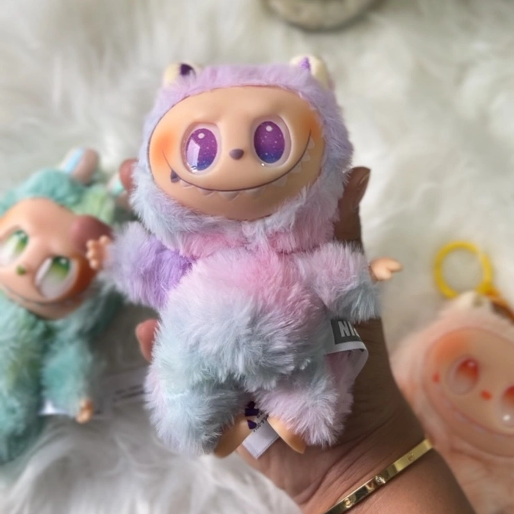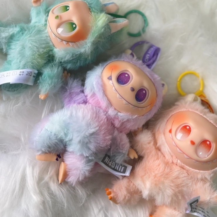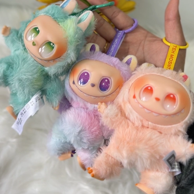 Three Labubu plush keychains — whimsical, fantasy-style creatures with big grinning faces and fanged smiles.