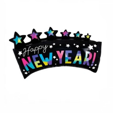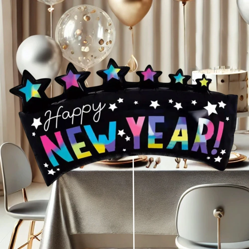 Vibrant Design: Features colorful letters spelling "NEW YEAR!" in a gradient of rainbow hues, making it eye-catching.