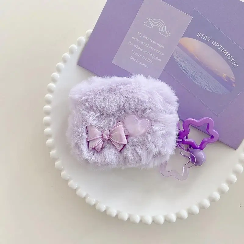 Hereβs a purple furry bow AirPods case description in points based on the product style: